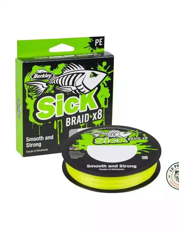 Tresse Berkley Sick Braid x8 HV Yellow 270m, 8 brins, très résistante à l'abrasion. Faible élasticité, parfaite pour ferrages précis et lancers longs sur carnassiers.